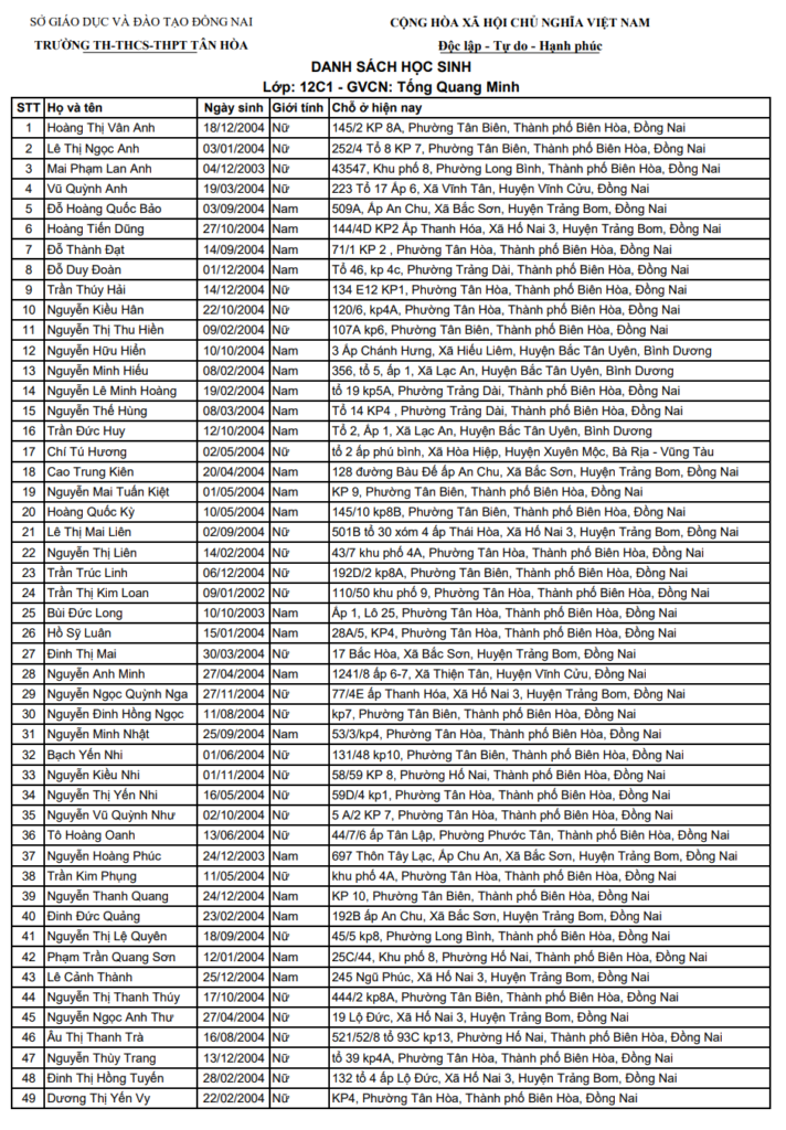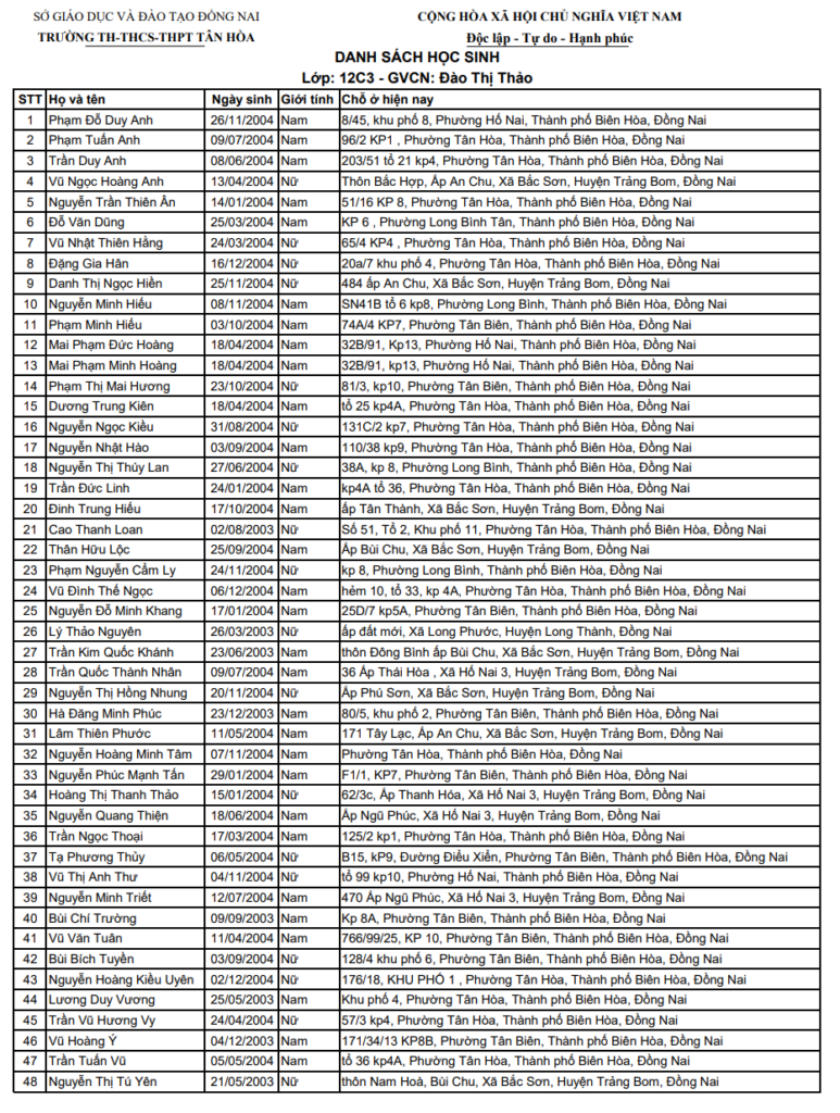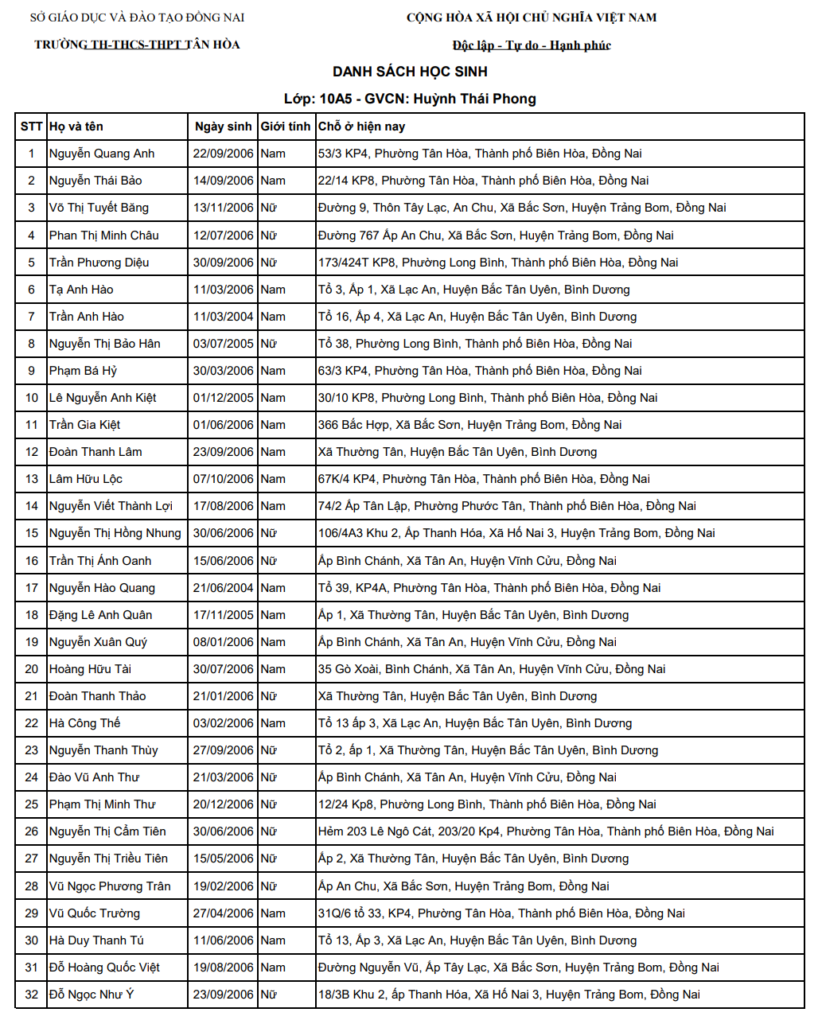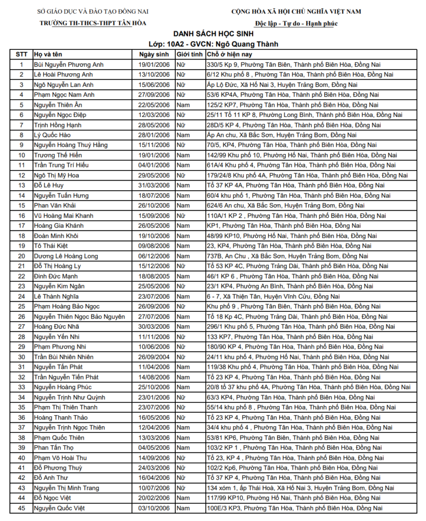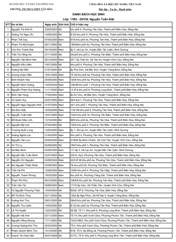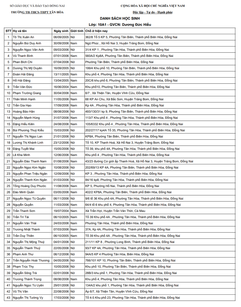 Trường TH, THCS & THPT Tân Hòa đăng tải danh sách các lớp và học sinh Bậc THPT năm học 2021-2022