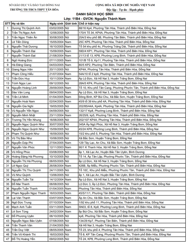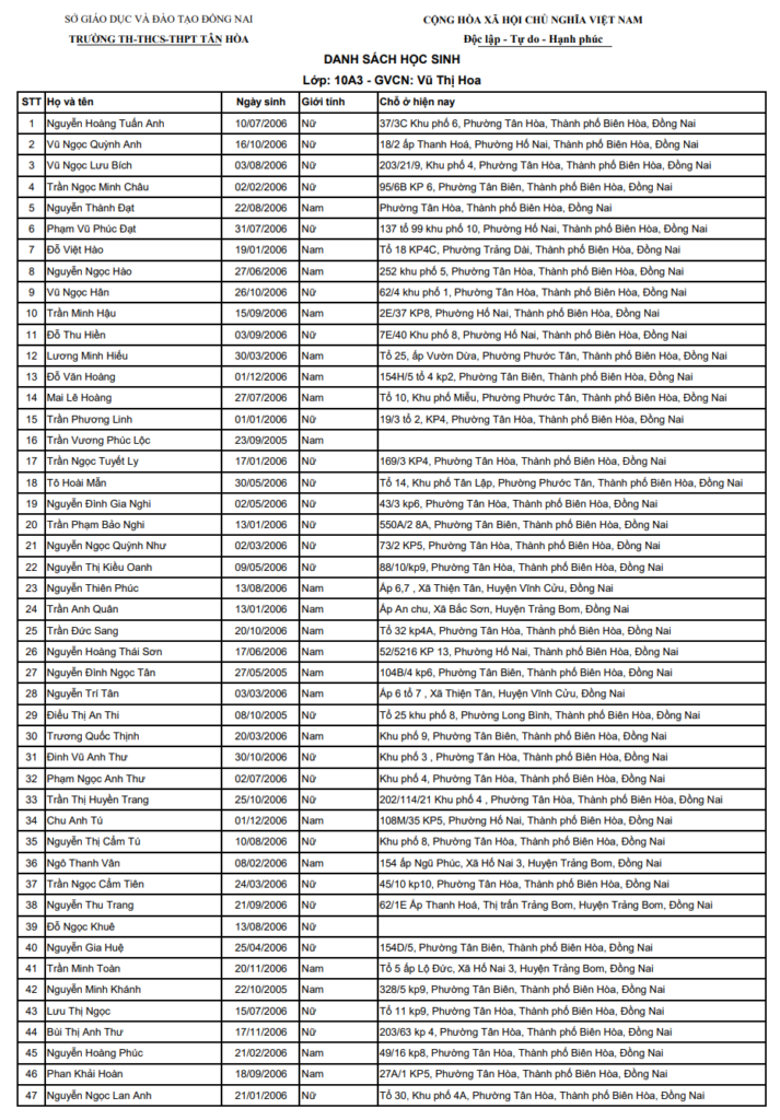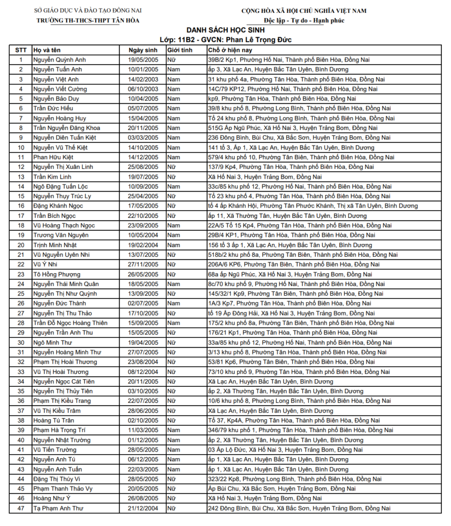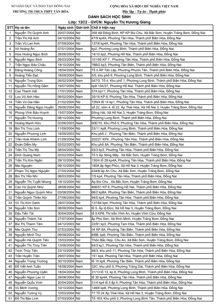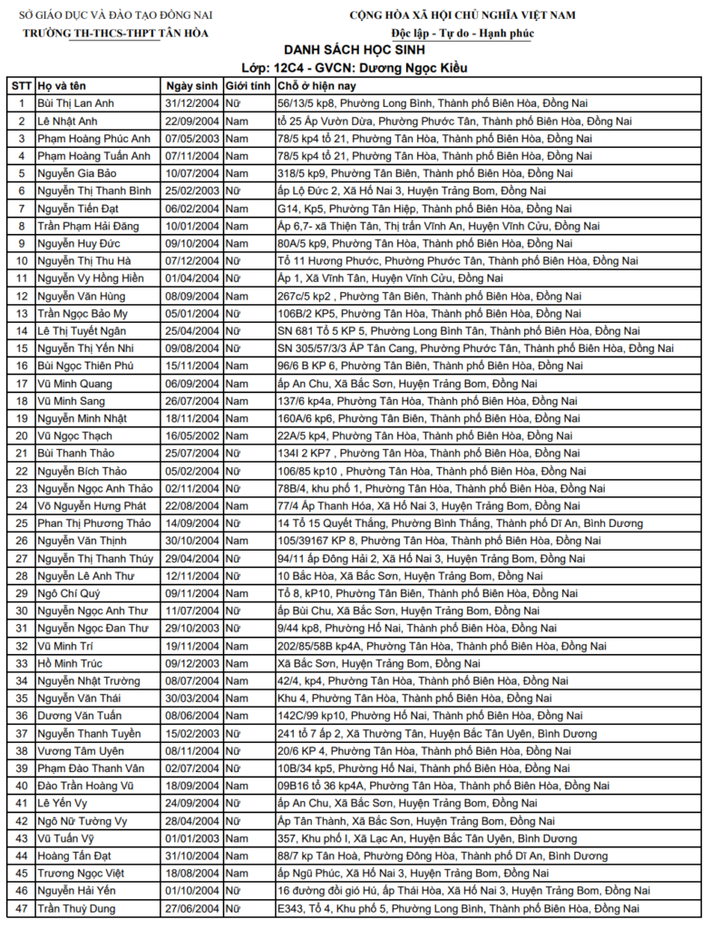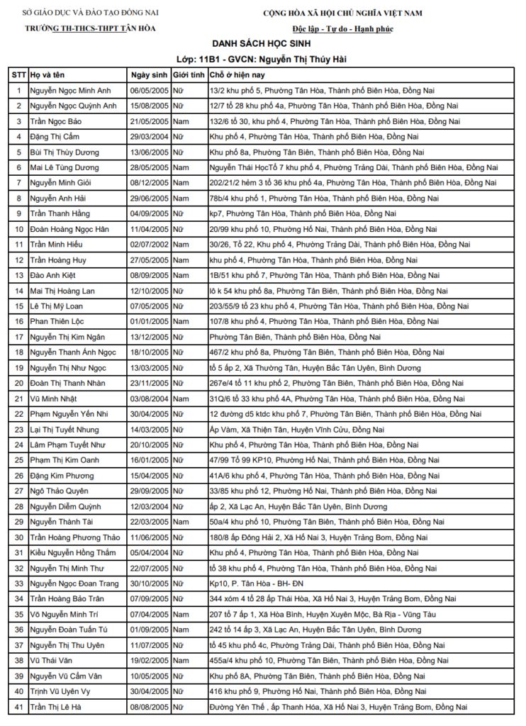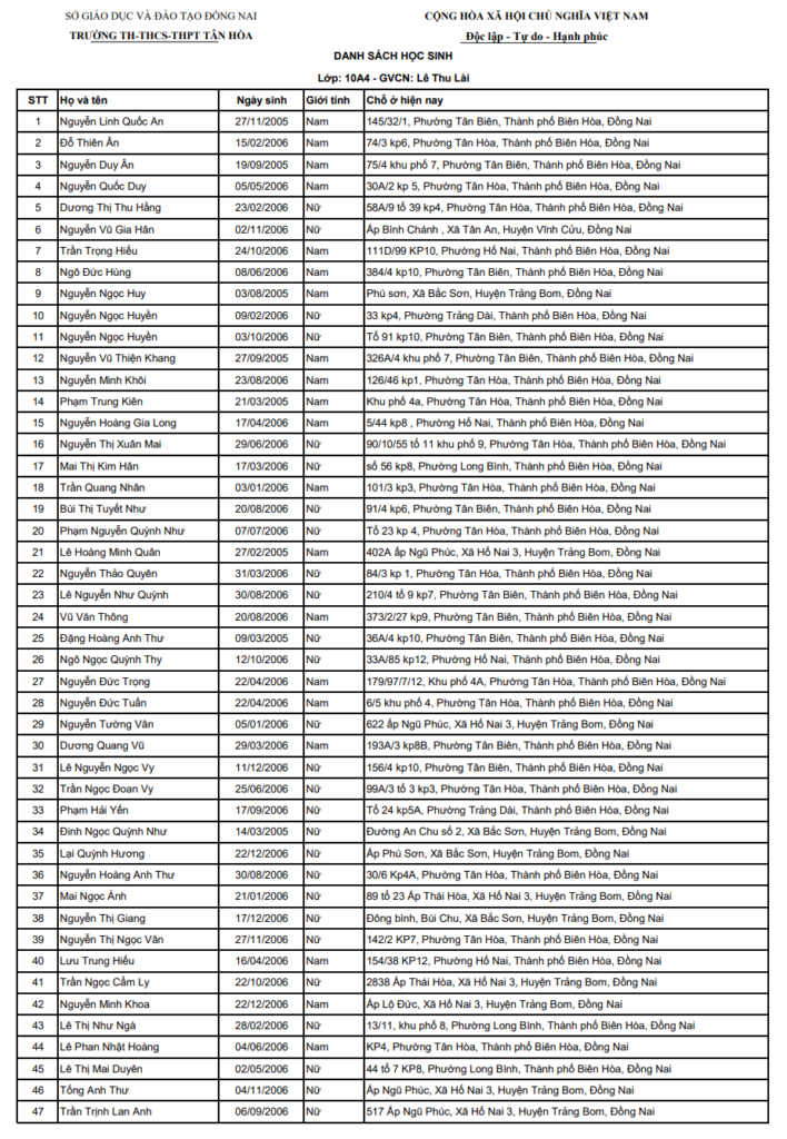 Trường TH, THCS & THPT Tân Hòa đăng tải danh sách các lớp và học sinh Bậc THPT năm học 2021-2022